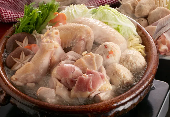 みやざき地頭鶏の鶏ガラを数時間炊き込み旨味を抽出。抗生物質、ホルモン剤等を一切与えず育てあげる地頭鶏だからこそ、最後まで安心して飲めるスープです。ぶつ切りした地頭鶏とつくね(若鶏軟骨つくね)を入れ、お好みの野菜を入れて自家製ポン酢でどうぞ。