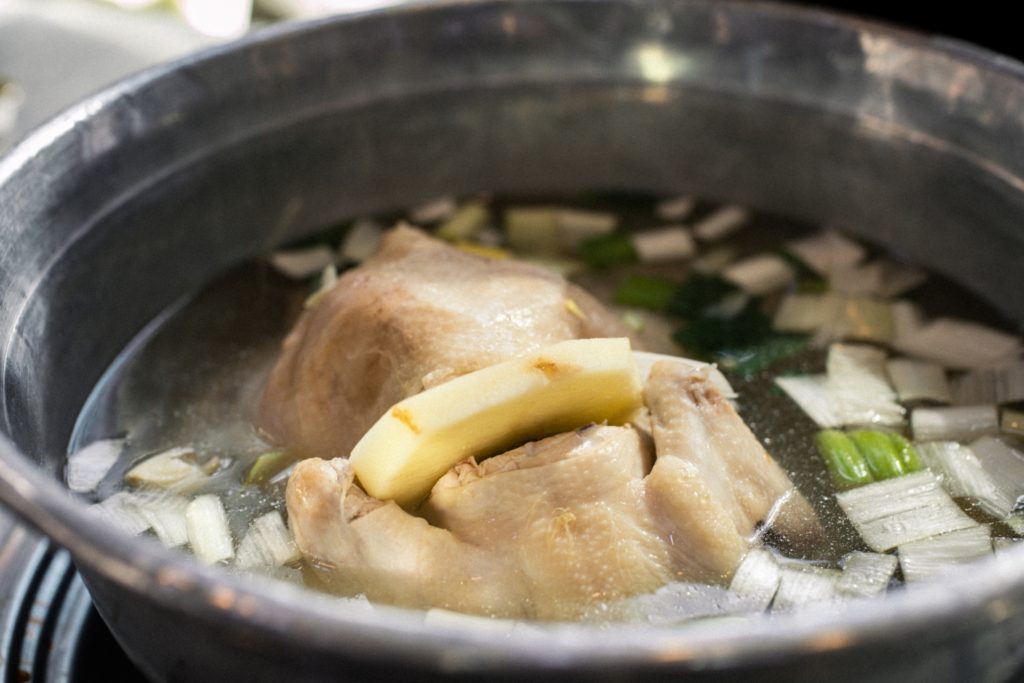 - 地頭鶏を適当な大きさに切り分け、鍋にだしを加えて温め、沸騰させる。